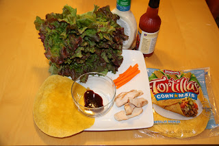 Heat up the veggies in a small fry pan over medium heat for just a minute. ( I prefer them crunchy) Season the Chicken Breast with Salt and Pepper until lightly browned. Add 30 ml of water to the pan cover and cook for 4 minutes on each side until it is cooked through. Remove from pan and slice into strips, Whisk together the barbeque sauce, hot sauce and salad dressing in a bowl. Add chicken and carrot, toss to combine. Divide the chicken mixture onto tortillas and top with lettuce, my girls like a little cheese too!